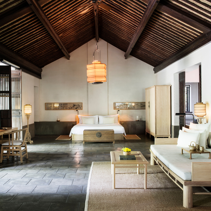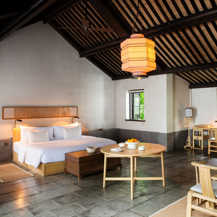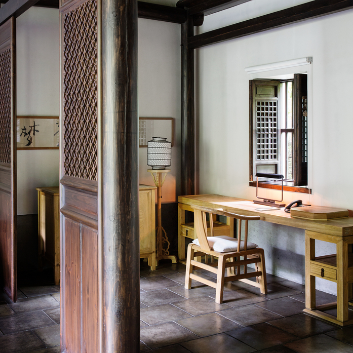 Embracing the layout and spirit of a traditional Chinese village, Amanfayun is a place of winding stone footpaths and shaded courtyards through which the dwellings – some dating back over a century – are accessed. Roofs are clay tile and interior floors are stone or wood, and some offer upper floors with views over the treetops. Fine calligraphy art pieces decorate the walls