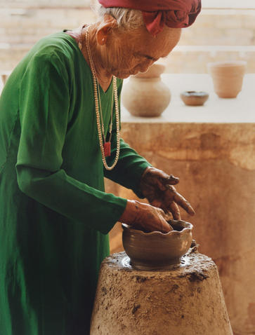 At the Bau Truc Pottery Village, a similar scene unfolds. In the back, a crew of veterans are hard at work upholding this traditional craft. One elder, who we simply call “Auntie”, is dressed in a long, mint leaf-green tunic and traditional burgundy Cham headdress. She's in her eighties and has been making pottery her entire life. In Cham tradition, there are no mechanical wheels. Instead, she walks in circles, gradually moulding and forming the clay with her hands. She hardly looks up, concentrating on pinching the vase to resemble a flower.